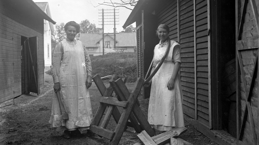 Två kvinnor klyver ved, Villa Göta syns mellan uthusen, mellan slakteriets bodar, vårt (Bremsjös) hus bakom. Identifikationsnummer 1M16-A145306:968, Västergötlands museum.