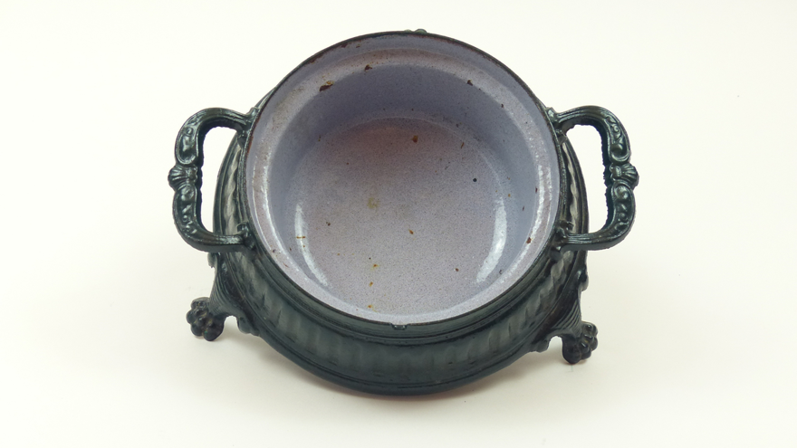 Denna spottkopp är tillverkade på Forsviks bruk. Spottkoppen är en gåva från Klas Kihlström i Forsvik. I verkstäderna yrade det av smuts, damm, jord och andra partiklar. Arbetarna som arbetade i lokalerna fick in detta i sin näsa, svalg och lungor. De blev torra i munnen och kände ett påträngande behov av att spotta. Kanske de behövde spotta ut snus också för den delen. Då fanns denna uppsamlande kopp till undsättning!